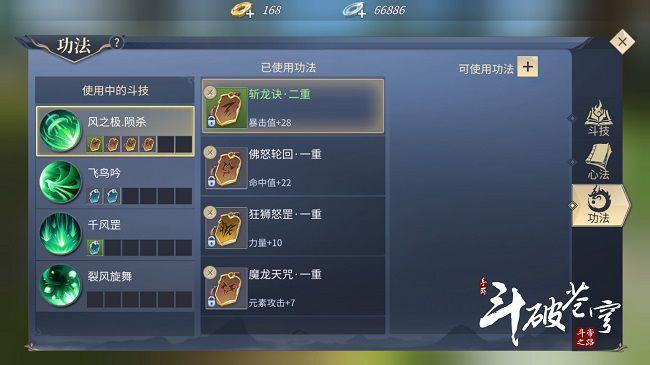 每个斗技可以装备6种功法,同一种功法在同一个斗技上只能装备一本。目前10级功法有10种,都是黄阶中级功法,大多数都可以通过斗气阁、家族炼药等活动获取,一般玩家可以选择先使用10级功法。只要功法搭配的好,低级功法也能有高属性,