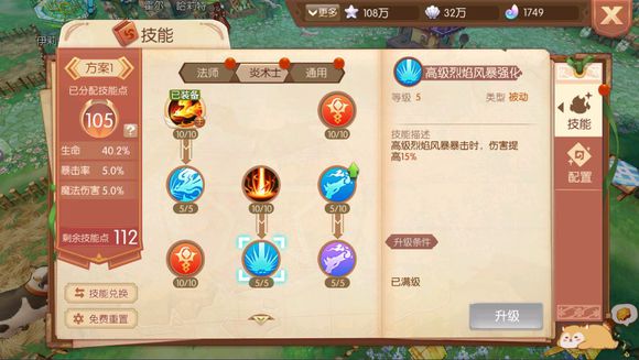 第二页炎法师普攻点5级,普攻强化点满,高级烈焰风暴强化前期可先不点