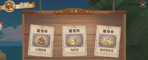 第二日之后玩家再次点击许愿活动就会来到许愿获得的奖励中心,系统会出现三张卡片,玩家自己选择一张进行领取奖励,领取的奖励会是玩家三个许愿中的一个奖励。