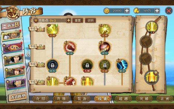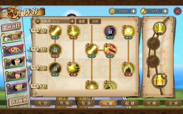 需要说明的是图中的这一套加点是比较不完美的,原因在于我个人目前还没有攒齐三大将,对于拥有三大将的船长,我推荐直接放弃光速踢,因为如果你点了光速踢又点了光柱再加上一些必点的技能,把技能书的限制次数都用尽了(只能点到13级),也是不够点三大将BUFF的,三大将BUFF满级之后的增幅是20%的暴击率、暴击伤害。再次强调,点光柱的话,我们要放弃光速踢。