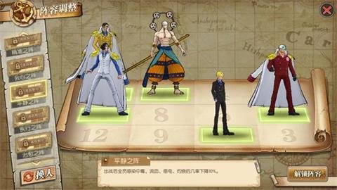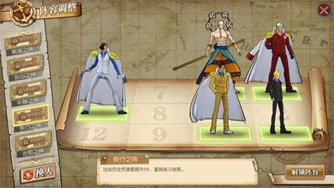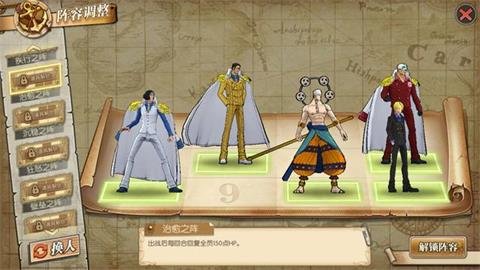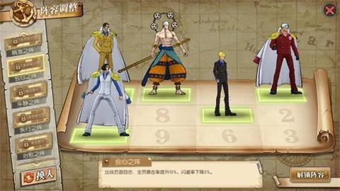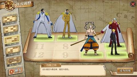 虽然不多但是,多一点血有时还是很有用的,此阵型避免了黄猿的多伤害,但是中间三人一条线遇到艾斯和艾尼路或者鹰眼那就躺了,如果对方属于单点爆发可以使用,有直线攻击就直接放弃吧,过任务血量不够时可以使用!