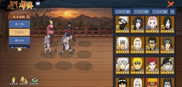 站位方面千手柱间和次郎坊中排抗伤,左近右近和风主在后排主输出以及辅助。