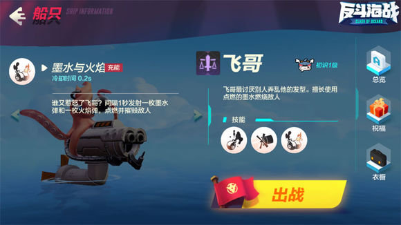 墨汁效果造成敌人减速后,还能被主炮的炮击点燃,作为阿飞的招牌起手技能,让很多船只一旦被命中就感觉已经凉了半截,天知道什么时候就引火烧身了。所以阿飞总是会在爆炸输出之前用墨水瓶作一轮前戏铺垫,然后再利用抛物线型的炮弹隔障碍物开始一轮点燃轰炸。