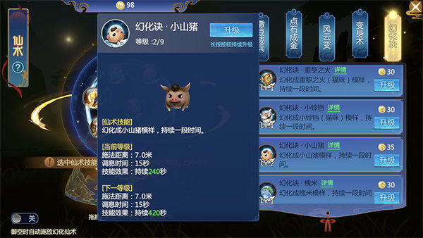 幻化成小山猪的仙术一共有九级,随着玩家等级的提升,玩家维持小山猪形态的时间也就越长。在最初等级时,该仙术的施法距离有7米,调息时间是15秒,而持续时间是120秒。想要成为厉害的小山猪,就需要多多提升仙术等级,仙术可以通过消耗仙缘点数来提升。