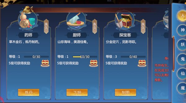 厨师这个身份对各位仙友来说,可以说是非常重要的,能够对各位仙友起到的帮助也特别大。激活了厨师身份之后,各位仙友就可以下厨制作很多主食、蜂蜜和甜品供自己使用或者是摆摊出售。厨师初始等级为1级,通过不断的下厨,仙友的厨师等级也会越来越高,能够制作的食品种类也越来越多。除此之外,厨师等级每达到一定的等级,仙友都能够获得额外的奖励,如厨师等级达到20级的时候,就能够获得称号庖丁解牛,达到25级的时候,更是有100元宝的奖励。