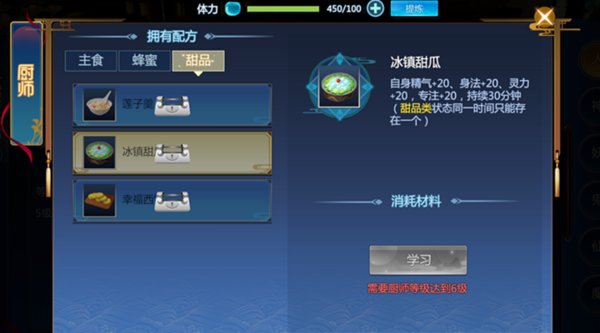 可千万不要小瞧了厨师制作的食物,不同的食物他的作用是不同的。如甜品中的冰镇甜瓜,每次使用都能够在接下来的30分钟内增加自身的20精气、20身法、20灵力、20专注。这个在与敌人旗鼓相当的时候使用,绝对可以起到决胜的作用。而像蜂蜜制作与使用,更是可以提高自身挂机获得的经验,这对于追求等级的仙友来说,绝对是非常实用的。