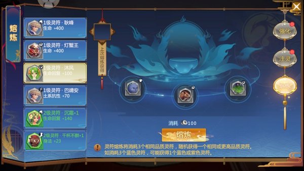 当然,如果获得的灵符是你不想要的部位和属性,也可以赌一下人品,3个不同的灵符可以熔铸出1个新的同级别或者更高级的灵符,一发入魂时间到!