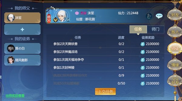 首先在仙友拜完师傅之后,就会出现很多的任务等待着各位仙友去完成。每一个任务的完成师傅都能够获得一定的师徒点,而徒弟在完成师徒任务的时候,则是能够获得对应的经验奖励,不同的任务完成所获得的经验也是不同的,最高一个任务徒弟是可以获得将近一千万的经验。在所有的徒弟任务完成之后,所获得的经验是巨额的。