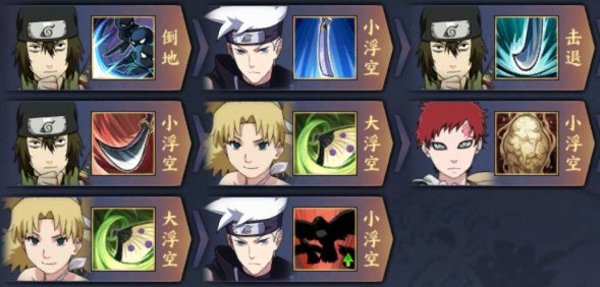 【分析】:利用武者根性提供带刀忍者免疫来增加连击的稳定性。连击链条比鬼鲛我爱罗的长,虽然相对比较容易断(连击越长越容易被干扰),不过我爱罗,月光疾风+雷主根性三个免疫状态,稳定性也很足。月光疾风的点杀能力搭配手鞠的爆发力效果很高。