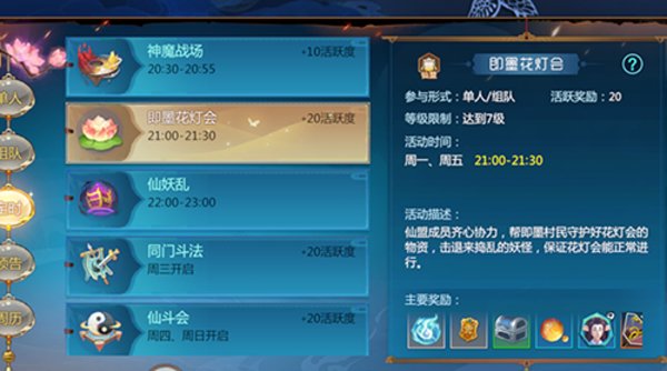 “即墨花灯会”是一周开启两次(周一、周五)的仙盟活动。活动开启后5分钟之内仙盟至少有5名成员进入即墨村,就可以正常开启活动。各位仙友需要提前组好队伍,待到活动开始齐心协力帮助即墨村民击退捣乱的妖怪,保护好物资,以保证花灯能够正常举办。