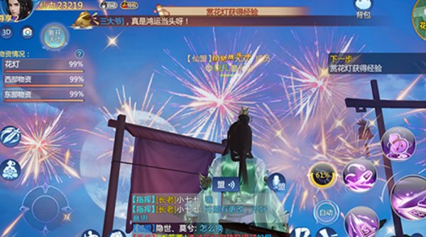 消灭了怪物、保护了物资,剩下的就是正常开启花灯会了。随着仙盟负责人一声令下,花灯会开启,各位仙友就可以一同欣赏绚丽的烟花了。在花灯会开启的过程中,各位仙友还能够持续获得经验,除此之外,广场上还会出现大量的美酒,各位仙友可以借此试试各自的酒量如何。