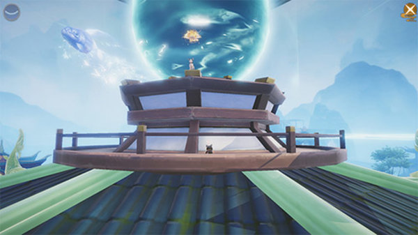 首先,我们只需要御剑飞行,到这个亭子的亭檐上。然后使用重黎技能,变身成为一只小猫咪。最后,使用猫咪飞扑的技能跳到走廊上,在走廊上走动,来到小猫咪的下方,再次使用猫咪飞扑的技能。这时我们就会发现,自己跳到了苗苗的头上。