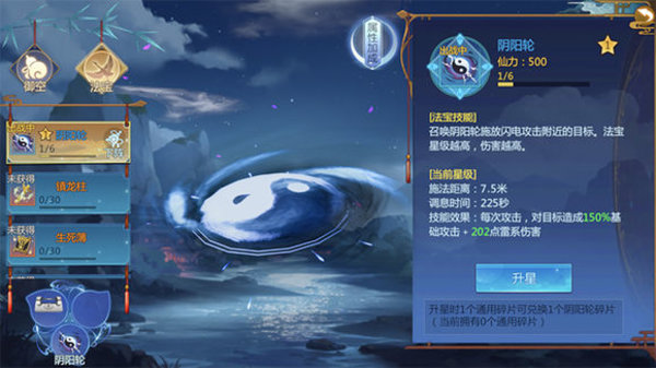 法宝阴阳轮最开始只有1星,想要升星需要消耗6个通用碎片或阴阳轮碎片和少量的银币,升星之后阴阳轮的攻击效果将会更强,增加的仙力也会更多,另外还会增加玩家的一个基础属性。