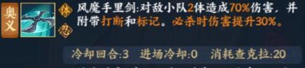 分析:开局就能够释放的控制奥义之一,虽然没有井野的混乱,鹿丸的定身那些强不良状态好,只是单纯的打断,不过他有附带标记状态,不仅能打断别人还能暂时降低2体单位的双防,可以配合月光疾风来点杀,还能够捏着奥义强行让对方不敢放奥义。
