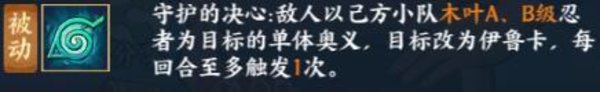 分析:开场就能够为带有木叶标签的忍者舍身挡1次单体控制类奥义,能够保护我方鹿丸或者井野后手控制,还能够保护我方1号位的木叶忍者不被后手控制顺利到第二回合。