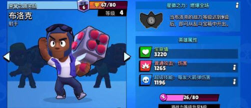 布洛克是一个远程狙击型英雄,他的单发伤害非常之高,而且还是小范围的AOE伤害,在宝石、赏金猎人等模式中,布洛克都有着不错的表现。布洛克的操作难度不低,需要玩家对敌人的走位有一定的预判,9级之后如果解锁星辉之力,他的战术能力则会得到大幅度提升。布洛克的星辉之力能够让他的普攻附带范围的灼烧效果,在远程消耗、封走位方面的作用更为明显,同时对他的大招也是一个极大的增强。