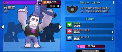 弗兰肯是游戏最肉的两个英雄之一,而他的输出能力也非常给力,大扇形的范围输出,单发普攻高达1200,是一个AOE能力相当出众的英雄。他的大招能够给敌人附加眩晕效果,是一个非常出色的群控技能,同时具有破坏掩体的能力。在宝石、足球、赏金模式中,弗兰肯都很受队友欢迎。需要注意的是,弗兰肯释放大招有一个超长的前摇,玩家尽量躲在草丛中放大招,打敌人一个出其不意。