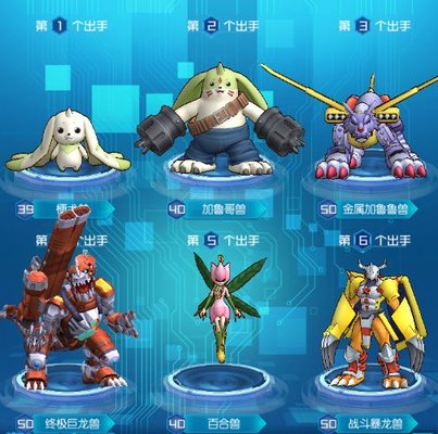 阵容搭配:梗犬兽+加鲁哥兽+花仙兽+3个输出数码宝贝(我的是战斗暴龙兽+金属加鲁鲁兽+终极巨龙兽)