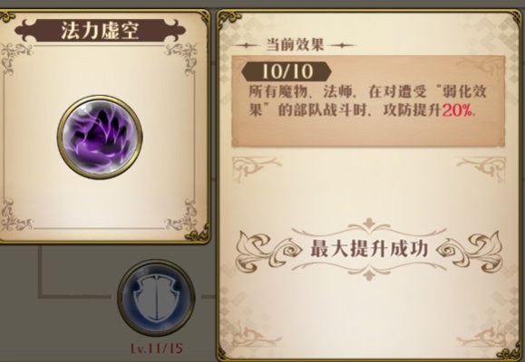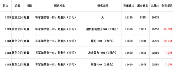 第二行开始是黑色新娘在战前触发4种DEBUFF之后的伤害,表里不难看出,在出-30%魔防和遭受伤害提升20%这两个效果时,暗镰单点能力输出提升幅度非常高。在从后面两行数据看出,拉娜在单体输出几乎没有变动的情况下,魔女的输出提升了7.4%左右,这个提升就是法师独有科技【法力虚空】所带来的增益。