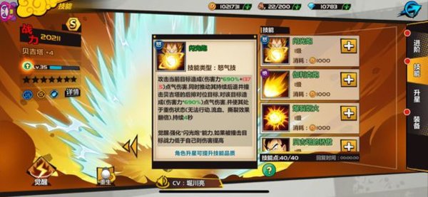关于贝吉塔,我要说的是我之前觉醒加8贝吉塔,一个必杀打了对面800血………对800,我以为我看错了,但就算是对方血量比我高,输出也不应该这么低啊,而且技能描述我也没看错,当前目标,在次我也不能打800多输出吧?这个图是技能图,贝吉塔已经重生了,觉醒给了丹迪