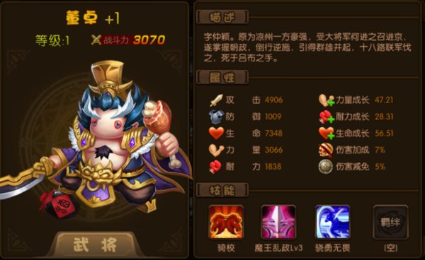 董卓这个武将从一开始到中期你只要强化到15即可,但是到达15你那时候已经很强了,因为董卓自身的三围就很惊人。