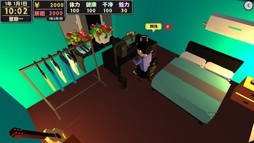 属性与生活2即将在4月中旬开测后我们已经提前进入游戏体验了,整体感觉游戏对新手玩家更加友好了。与前作最大的不同是这一次我们增加了一个室友——阿伟,我们和他一起租住在一个公寓中。另外游戏的属性变得更加简单明了了,只有四种属性,分别是体力、健康、干净、魅力,这与更方便新手玩家们的理解。