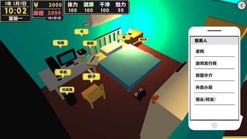 我们的房间中可以看到电脑、收集、书、画册、床等基础物品,使用手机可以打电话,有时候如果太穷,打电话给老妈还可以获得资助,如果后期研发出游戏,还可以打电话给开发商联络,可以卖出一个好价钱。