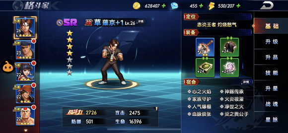 先把草薙京所有技能点到5等满等,星火>裕火>焚烧>热血>赤焰奈落