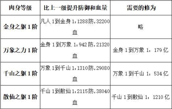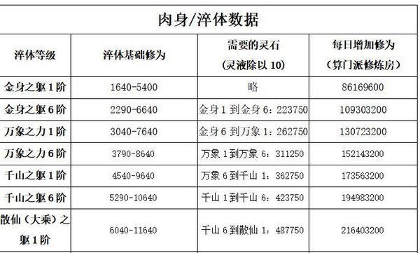 下面表格会列出各级肉身所需要的修为、淬体灵液灵石和效果。