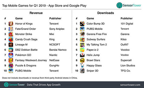 Sensor Tower发而2019第1季度手机游戏消费报告