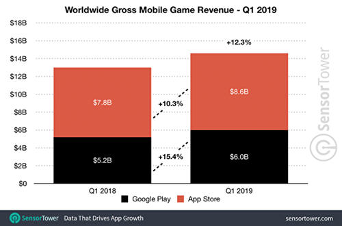 第三方调查机构Sensor Tower近日公开2019年第1季度手机游戏的盈收情况,Sensor Tower Store Intelligence data 显示在2019 年第1 季时消费者在App Store以及Google Play 商店消费约195 亿美元。与去年同期Sensor Tower 预估的167 亿美元相比,大约成长了16.9%,以上的消费包括了应用程式内的购买、订阅以及付费应用程式。