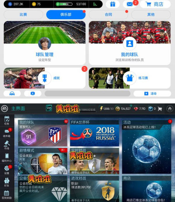 这个一开始我玩实况的时候,对于实况的主界面很不适应。因为之前适应了FIFA较为简单粗暴的界面,再看看实况的各种经纪人和球探,根本分不清是怎么回事,因为FIFA获得球员就是不断地开卡或者通过其他途径。不过后来玩的久了就慢慢熟悉了。两款游戏的主界面各有千秋,FIFA较为简洁,各个版块分的很清楚。实况分的很详细,顶部菜单四大选项分别代表四个不同用途的区域。这一点,两款游戏我个人觉得设计的都很好。