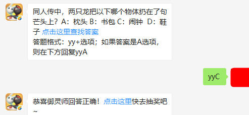 一起来捉妖微信每日一题2019年5月20日问我们:同人传中,两只龙把以下哪个物体扔在了句芒头上,其实这题目很多人都不知道正确答案,但是官方后面给出了查找答案的资料一看就知道正确答案是yyC