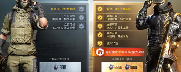 精英版在购买后即可解锁专属的奖励,并且立即获得特战英豪、SCAR-L黄金龙骨等奖励;