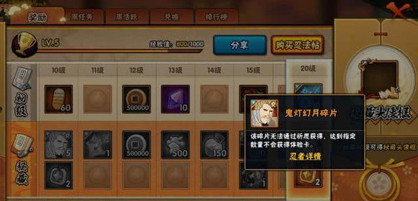 这个忍法帖玩家只需要花费25元人民币就可以开通。不过达到领取所有奖励的等级后你只能获取总数80的忍者碎片,S忍者可是要100个哦,那么剩下的20个建议玩家们可以通过组织来乞讨吧!