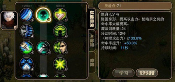 推荐技能1隐身(潜伏):隐匿身影,从而大幅度的提升攻击力,并使得暗杀之剑的命中率增大,随着级别的提升,物理攻击力的提升将更大。
