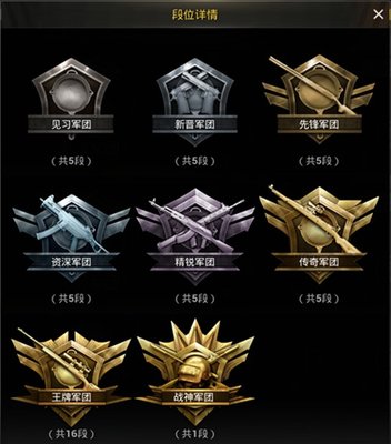 和平精英兵团段位等级分为八个,从低至高分别是:见习兵团、新晋兵团、先锋兵团、资深兵团、精锐兵团、传奇兵团、王牌兵团、战神兵团。