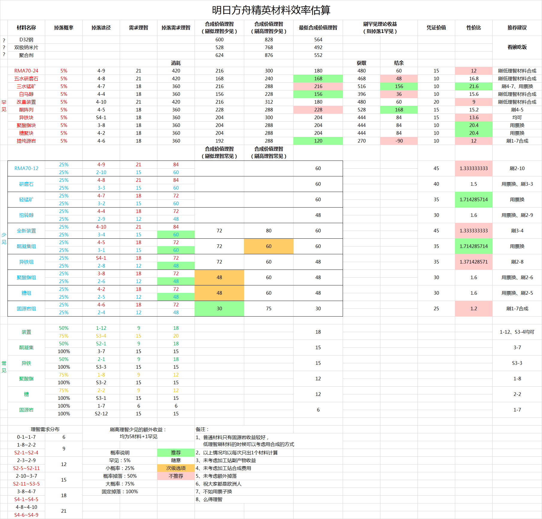 说明:常见指绿色材料,高低理智分别指同一种材料对理智需求高低的不同关卡