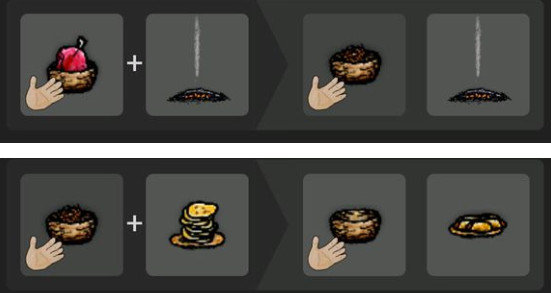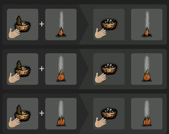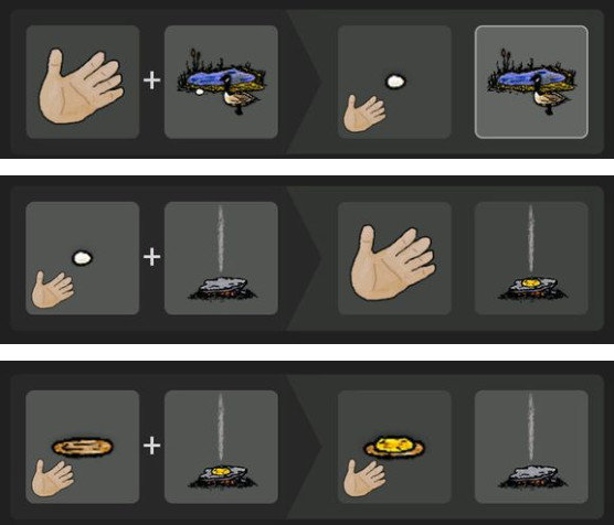 火堆变成热煤之后,放上一块扁石,用手拾取有蛋的鹅塘里的鹅蛋,放在烧热的扁石上,会变成熟的煎蛋卷,十秒钟后会烧焦,一定要及时用陶盘接取。只要鹅塘在,鹅蛋就可再生,很不错的食物来源。