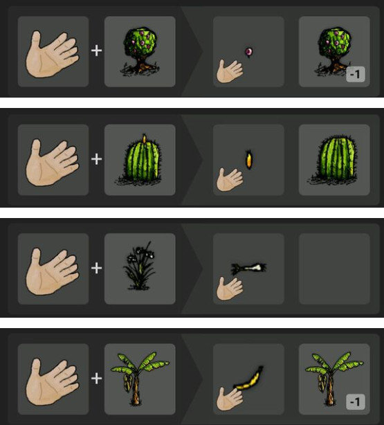 要注意的是,仙人掌只有在玩家发现后才会开始生长开花结果,每10分钟结好一次果实。野生醋栗每10分钟长一颗新果子(家养的不会),野葱和香蕉都不可再生,只能系统刷新。