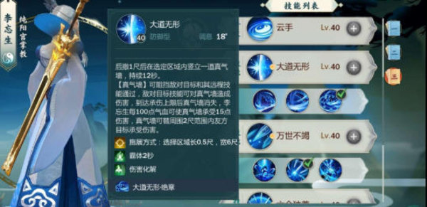 大道无形是李忘生pvp的灵魂技能,甚至于在pve中都可以使用气墙来回避伤害,也是李忘生最标志性的技能。
