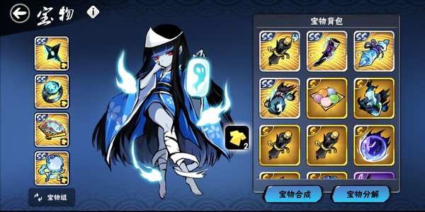 宝物:宝物方面水套玉狐套,水套刀鞘/拢手+寒冰,没寒冰拢手加刀鞘,根据地图属性既死/缴械/死穴换上寒冰忍宗魂水