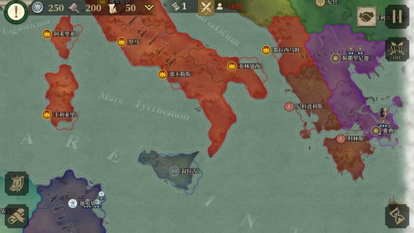 开局直接把兵派出去去打埃托利亚的两个城,直接去打城,很轻松拿下。之后生经济,把兵全派到昔兰尼去打主城,这个时间点千万要记住,不要爆兵,有一队守城就行,看看左边的两位大哥要是罗马方兵压过去了就给他们经济给到他们兵压过罗马了就行。