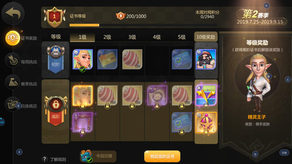 多多自走棋精灵王子身为一款顶级的传说级别的棋手皮肤,获取难度非常的低,简直就是可以说游戏白送给你的,只需要购买骑士证书高阶证书,证书等级达到1级就可以领取,是不是入手非常的轻松,骑士证书高阶证书需要使用里面的糖果进行购买价值高达6800糖果,目前没有任何的充值方法,只要你多玩游戏就可以买。