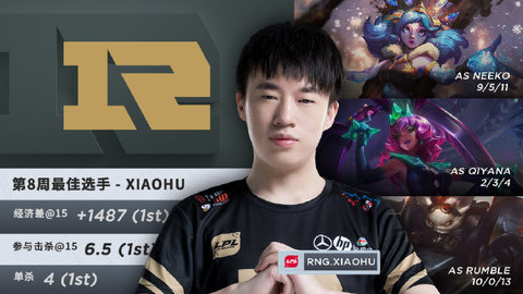 随着一周比赛的结束,联盟根据第八周所以比赛中选手的表现,评选出了第八周最佳的阵容,分别是来自BLG的上单ADD,RNG的中单xiaohu,FPX的打野xiaotian,FPX的射手LWX以及RNG的辅助MING,让小编来为大家盘点这周最佳阵容选手的精彩时刻吧!