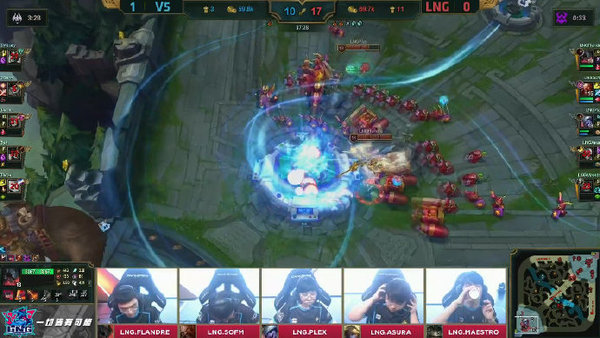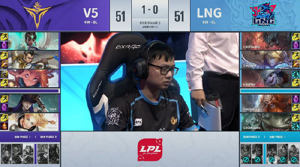 双方阵容来看V5没有选出一些冷门的英雄,反而是拿了一套中规中矩的阵容,LNG选出了各个位置选手们最擅长的英雄,但是在游戏前期妮蔻的一波失误走位直接让自己被V5上中野三人包夹,盲僧也是被佐伊击杀,拿下两个人头的佐伊直接起飞,在后面下路野区,盲僧被泰坦抓住也是再次让佐伊拿下两个人头,佐伊直接变成LNG最大的boss,虽然LNG选手选的都是自己擅长的英雄,但是整体阵容缺乏开团,这样本就劣势的他们处境更加艰难,最后LNG也是没找到什么机会被V5直接拿下。