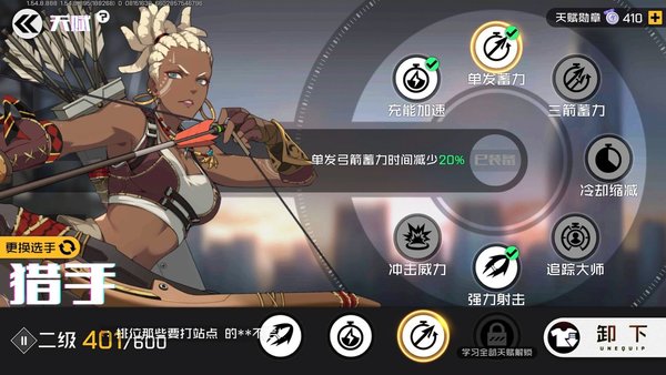 第三个天赋技能强力射击,大招飞行速度加百分之25这可以让你以最快的速度打到对面,不给对方一点反应的机会而且打中敌人有140的伤害这就是说,没有护盾的脆皮被你的大招碰上会有一瞬间被控,你的快速单发箭一箭就能带走,而你的快速大招能让对面的躲闪几率更小,而你打中敌人的概率更大,总结来说,玩猎手最重要的就是速度。