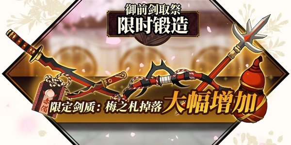 2. 出战武士装备铸魂后的活动限定武器,通关活动副本时即可享受梅之札掉落加成,多个武士的剑质加成效果可叠加。