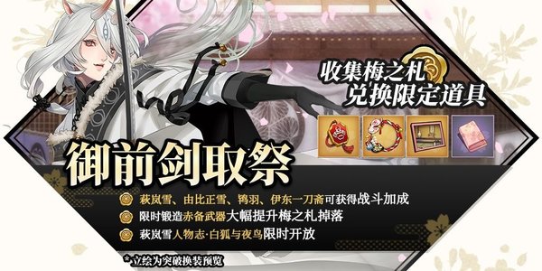 【梅之札】可以在活动商店中兑换SR由比正雪、限定SSR活动武器、限定头像框-御前剑取祭、限定御殿背景-武家造·剑守、活动限定武士浴衣材料,还有日之铃、大御神依代等稀有道具!