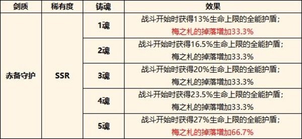 1. 活动限定武器铸魂后,解锁特殊剑质“赤备守护”:梅之札的掉落增加33%;剑质提升至5级后,梅之札的掉落增加67%